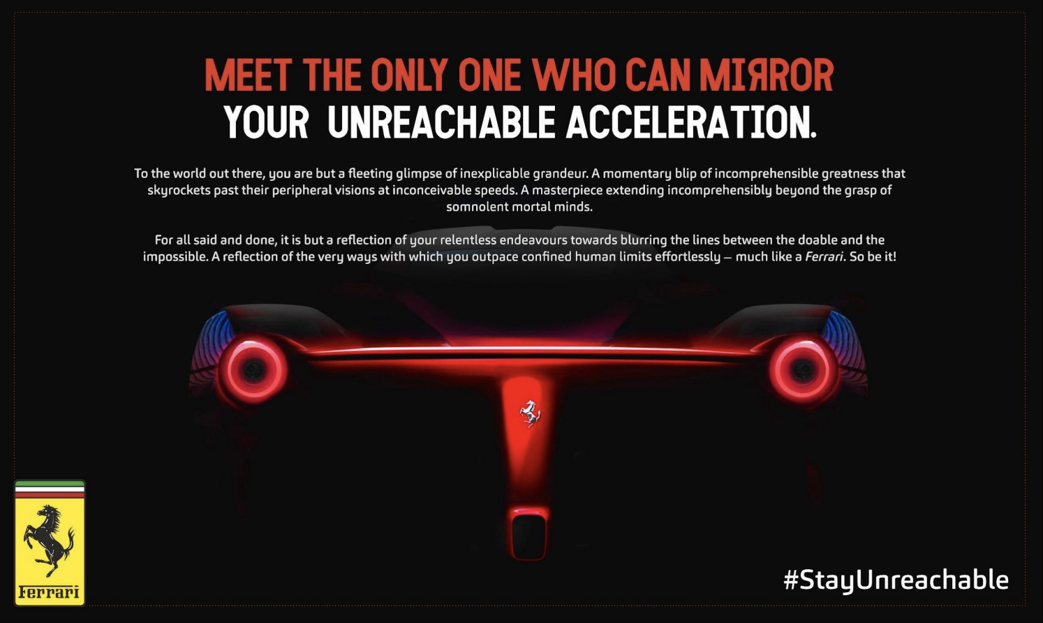 The idea came after a lot of brainstorming and insight that people who drive these cars are beyond the comprehension of a common man. They aren't reachable. Hence the campaign #StayUnreachable